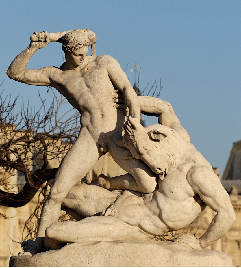 This painting shows Theseus killing the Minotaur. The painter has used lots of clouds within the painting, perhaps representing the Gods of ancient Greece.
